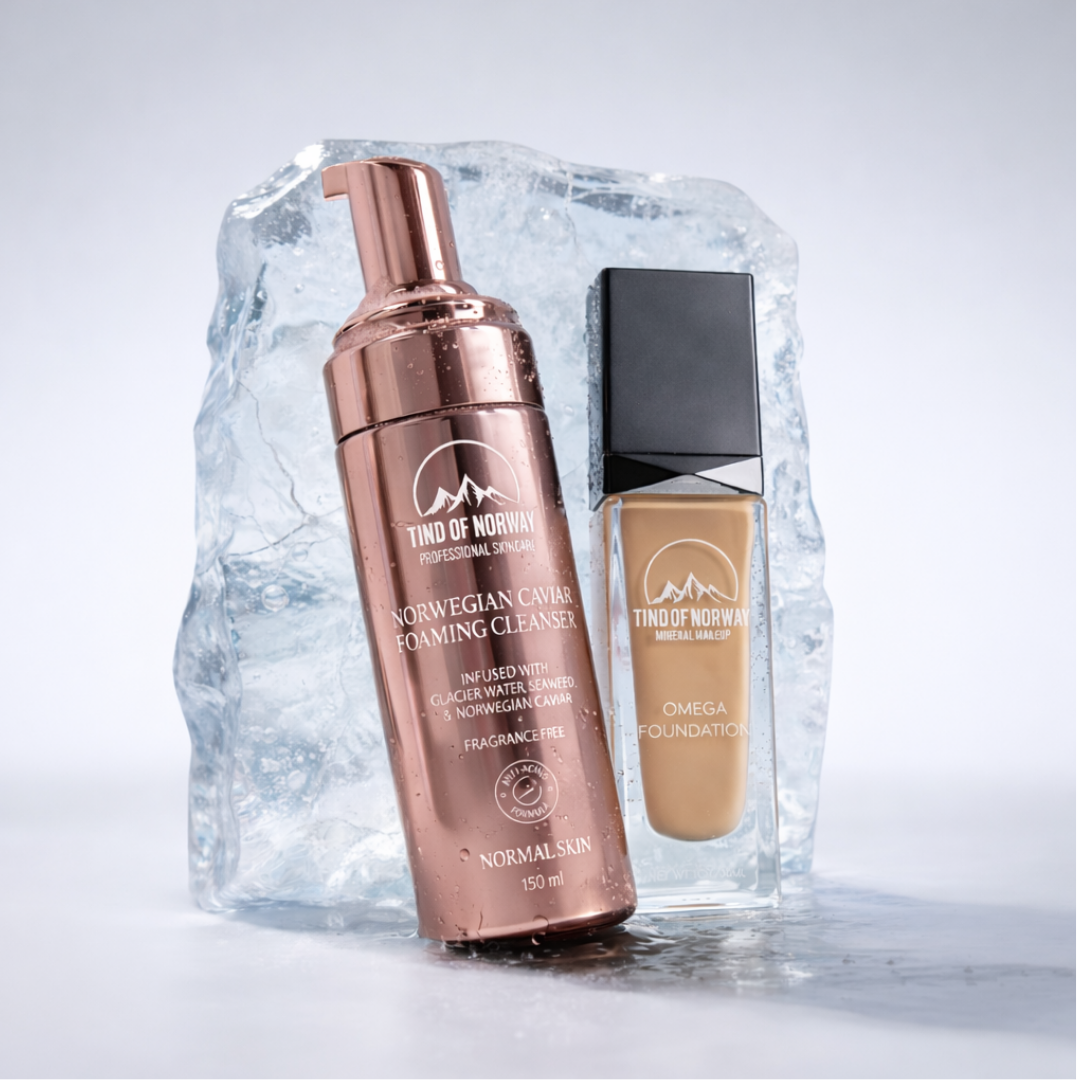 Face Duo kombinerer skånsom rens med pleiende foundation – fordi god makeup starter med ren hud. Norwegian Caviar Foaming Cleanser rengjør uten å tørke ut, mens Omega Foundation gir jevn dekning, fukt og glød.